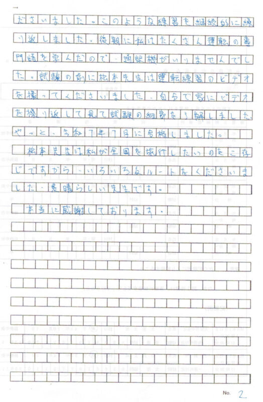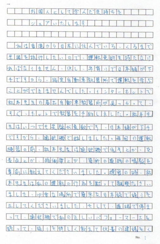 そして、道路端に停まって通訳機で運転の正しいことは褒めていただき、難しい内容は詳しく教えていただき、徐々に改善していきました。